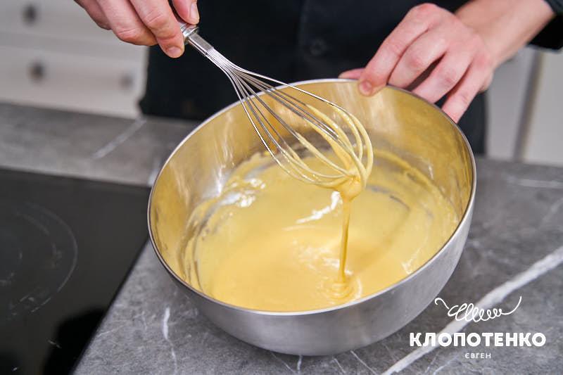 Збивайте жовтки віничком, поки суміш не побілішає і стане однорідною. Зніміть миску з парової бані, продовжуючи мішати суміш іще 30-40 секунд. Дайте жовткам охолонути.