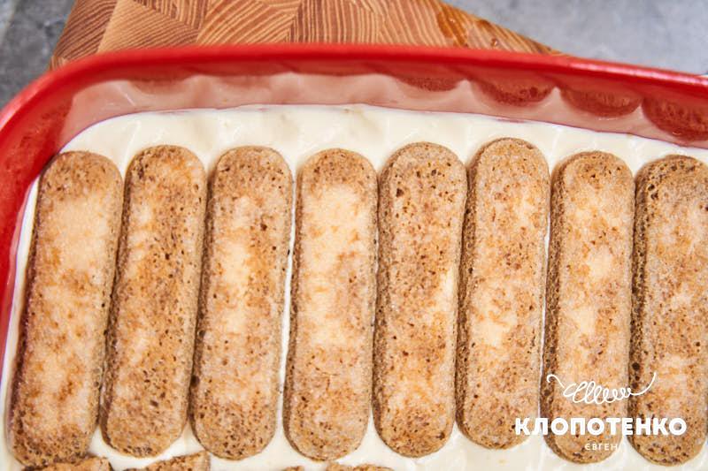 Коли форма буде заповнена печивом в один шар, рясно змастіть його кремом. Зверху знову викладіть просотане Савоярді і так по черзі, поки форма повністю не заповниться. Останнім повинен бути крем.